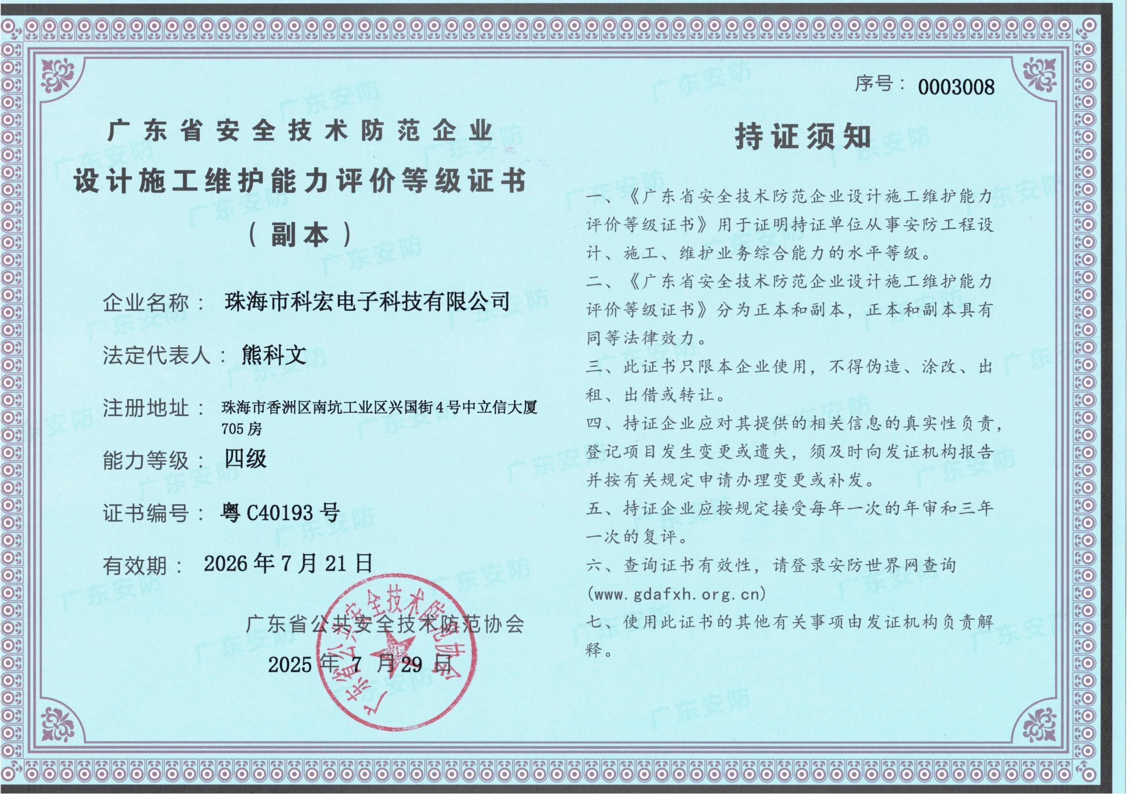 榮獲廣東省安全技術防範企業設計施工維護能力評價等級證書(四級)