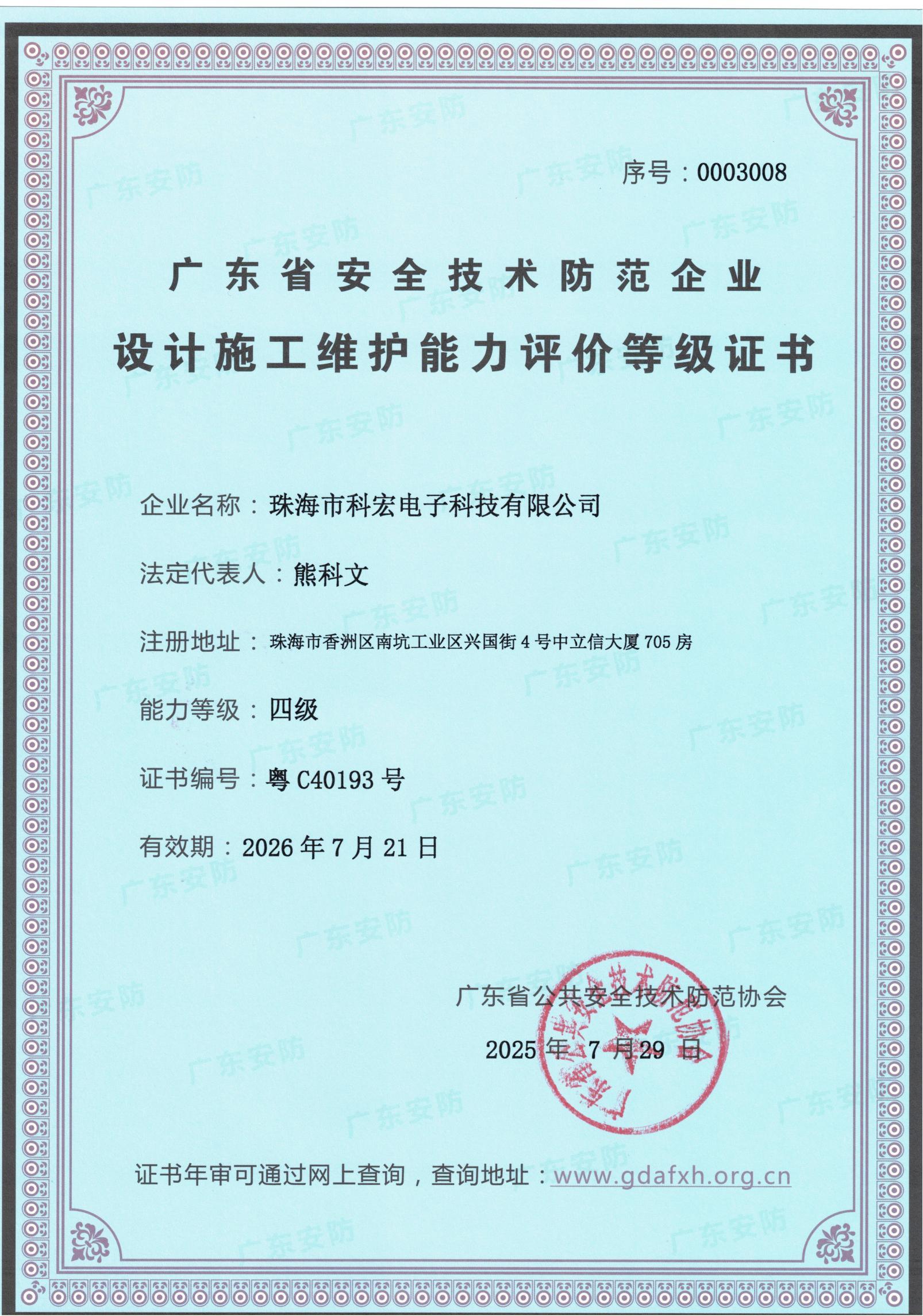 訊傳來! 珠海市蜜柚黄色污電子科技有限公司在安全技術防範領域取得了新的裏程碑——榮獲了廣東省安全技術防範企業設計施工維護能力評價等級證書(四級)!